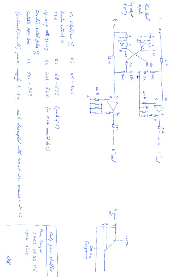 Blumlein's stroke of genius was to create a simple but very clever circuit that converted phase differences between the microphones into left / right channel intensity differences at these frequencies. He called this process shuffling. The output of the two microphones is fed into the shuffler (which only works below approx. 700Hz) which restores stereo at lower frequencies, thus giving intensity stereo throughout the entire frequency range. Unfortunately, later that year the directional microphone arrived in the form of the ribbon microphone and this technique was deemed to be obsolete. As someone said, "Invented in 1931, forgotten in 1932".