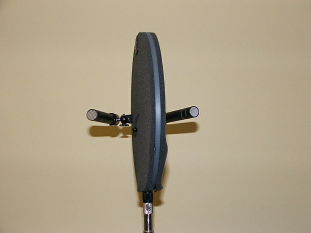 If you would like to try BDT for yourself, you can build your own shuffler. Download the circuit diagram. This shuffler assumes a spacing of 20cm and will give best results with this spacing. Remember that, if you use a baffle, it has the effect of spacing the mics much further than their physical spacing. In the pictures below, you will probably need to reduce the spacing between the capsules. I have found that making the mics virtually parallel to each other works best when used with this kind of baffle.